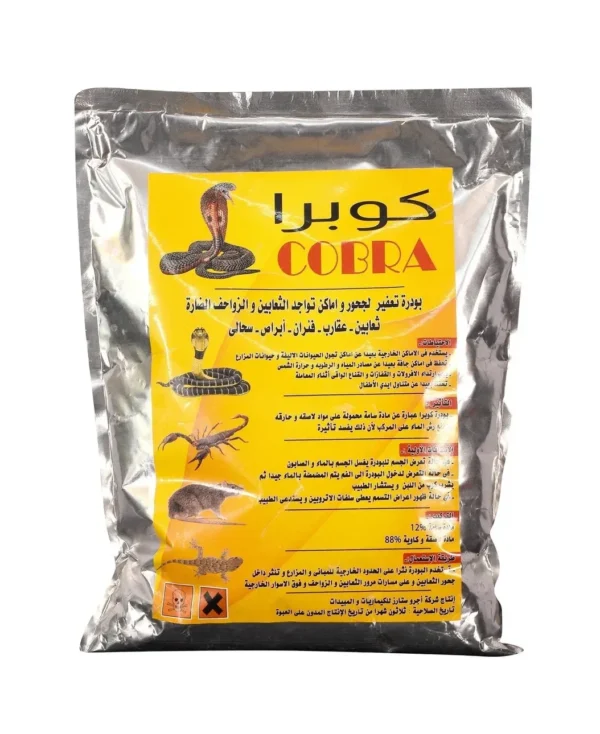 مبيد الثعابين والعقارب بودرة كوبرا عبارة عن مسحوق يتم تعفيره بالعفارة في جحور وأماكن تحرك الثعابين والزواحف الضارة، المبيد يقضي على الثعابين و يقضي على العقارب والسحالي والأبراص.